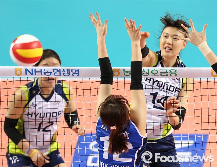 (화성=포커스뉴스) 17일 화성실내체육관에서 열린 2015-2016 V-리그 여자부 챔피언결정전 1차전 IBK기업은행-현대건설 경기에서 현대건설 양효진이 IBK기업은행 채선아의 블로킹을 피해 스파이크를 넣고 있다.