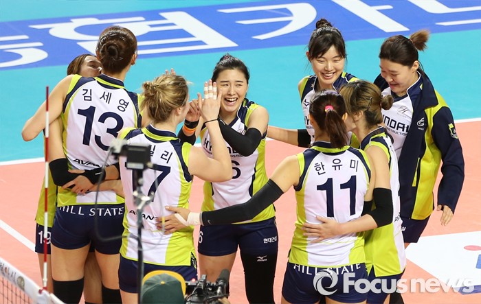 (화성=포커스뉴스) 17일 화성실내체육관에서 열린 2015-2016 V-리그 여자부 챔피언결정전 1차전에서 IBK기업은행을 물리치고 1승을 올린 현대건설 선수들리 코트에 모여 환호하고 있다.