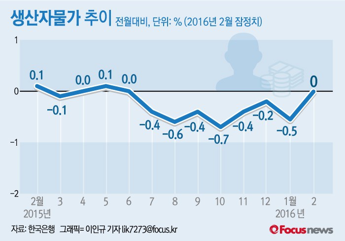 (서울=포커스뉴스) 17일 한국은행에 따르면 올해 2월 생산자물가지수(2010년 100기준)는 98.47로 전월 대비 보합, 전년 동월 대비 0.6% 하락했다.