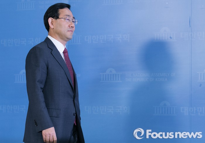 (서울=포커스뉴스) 공천 탈락한 주호영 새누리당 의원이 18일 오전 서울 여의도 국회 정론관에서 최고위원회의 재심 요구를 반려한 이한구 공천관리위원장과 관련 기자회견을 위해 입장하고 있다.