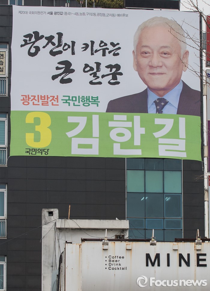 (서울=포커스뉴스) 김한길 국민의당 의원이 야권연대 무산 책임을 지고 20대 총선 불출마를 선언한 가운데 17일 오후 서울 광진구의 김 의원 선거사무소 건물에 20대 총선 예비후보 현수막이 걸려 있다.