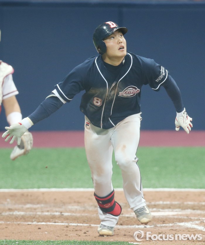 (서울=포커스뉴스) 18일 서울 고척스카이돔에서 열린 2016 프로야구 시범경기 5회초 무사 2루에서 두산 류지혁이 우중간 2루타를 날리고 타구를 바라보며 뛰어 나가고 있다.