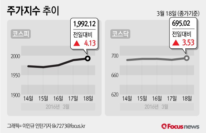 (서울=포커스뉴스) 18일 코스피지수는 전날 보다 0.21%(4.13포인트) 오른 1992.12에 장을 마쳤다. 코스닥지수는 전일 대비 0.51%(3.53포인트) 오른 695.02에 마감했다.