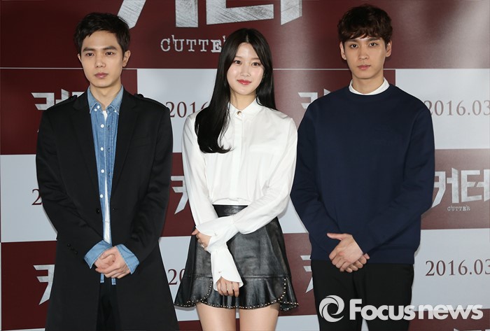 (서울=포커스뉴스) 18일 오후 서울 성동구 왕십리CGV에서 열린 영화 '커터' 언론시사회에 참석한 배우 김시후(왼쪽부터), 문가영, 최태준이 포토타임을 갖고 있다.