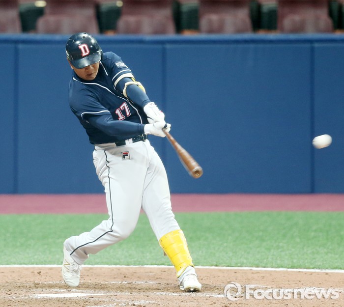 (서울=포커스뉴스) 18일 서울 고척스카이돔에서 열린 2016 프로야구 시범경기 두산-넥센 경기 8회초 두산 이우성이 좌익수를 넘기는 2루타를 날리고 있다.
