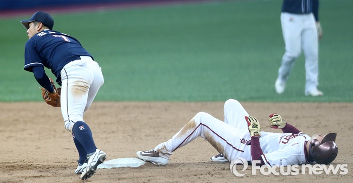 (서울=포커스뉴스) 18일 서울 고척스카이돔에서 열린 2016 프로야구 시범경기 두산-넥센 경기 8회말 넥센 공격 무사 1,2루에서 더블스틸을 시도해 2루에서 세이프된 이택근이 베이스를 밟은채 누워있다.