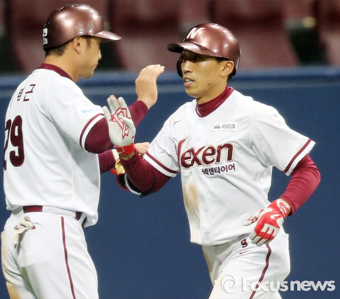 (서울=포커스뉴스) 18일 서울 고척스카이돔에서 열린 2016 프로야구 시범경기 두산-넥센 경기 8회말 넥센 박정음이 우월 동점 홈런을 치고 선행주자 이택근의 환영을 받으며 홈인하고 있다.