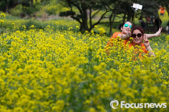 (제주=포커스뉴스)19일 오전 제주 서귀포 중문관광단지 일원에서 제18회 서귀포 유채꽃 국제걷기대회가 열리고 있다. 외국인 참가자들이 엉덩물계곡 만개한 유채꼿 길에서 기념사진을 찍고 있다.