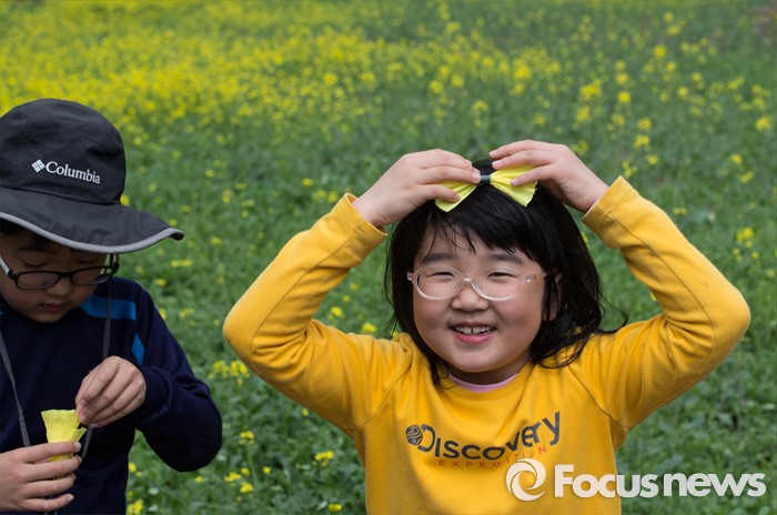 (제주=포커스뉴스)19일 오전 제주 서귀포 중문관광단지 일원에서 제18회 서귀포 유채꽃 국제걷기대회가 열리고 있다. 유채꽃 길을 걷던 한 어린이가 노란색 종이 리본을 머리에 올리며 활짝 웃고 있다.
