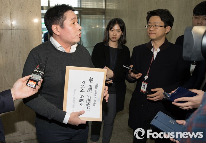 (서울=포커스뉴스) 19일 오후 서울 영등포구 새누리당사로 이재오 의원 보좌관이 공천심사 재심사 요청서를 제출하기 위해 방문, 취재진의 질문에 답변을 하고 있다.