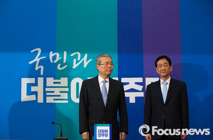 (서울=포커스뉴스) 새누리당에서 공천 배제된 뒤 탈당한 진영(오른쪽) 의원이 20일 오전 서울 여의도 국회에서 더불어민주당 공식 입당을 알리는 기자회견을 하고 있다.