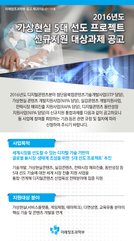 미래창조과학부는 18일 ‘VR 플래그십 프로젝트’ 중 핵심인 5대 선도 프로젝트 세부내용을 공고하고 접수를 시작했다.