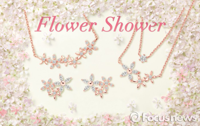 플라워 샤워 목걸이와 귀걸이는 프림로즈를 본딴 은 액세서리다. 크고 작은 꽃들이 비대칭으로 이어져있다. 핑크골드색 제품으로 목걸이와 귀걸이는 각각 1만9900원이다.