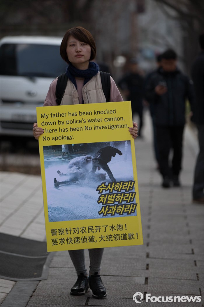 (서울=포커스뉴스) 20일 오후 서울 종로구 청운동사무소 분수대에서 백도라지씨가 경찰의 수사와 사과를 촉구하며 1인 시위를 하고 있다. 이날 백씨는 지난해 11월 집회 도중 물대포에 맞아 쓰러진 아버지 백남기씨 사건에 대한 경찰당국의 정확한 수사와 사과를 촉구했다.