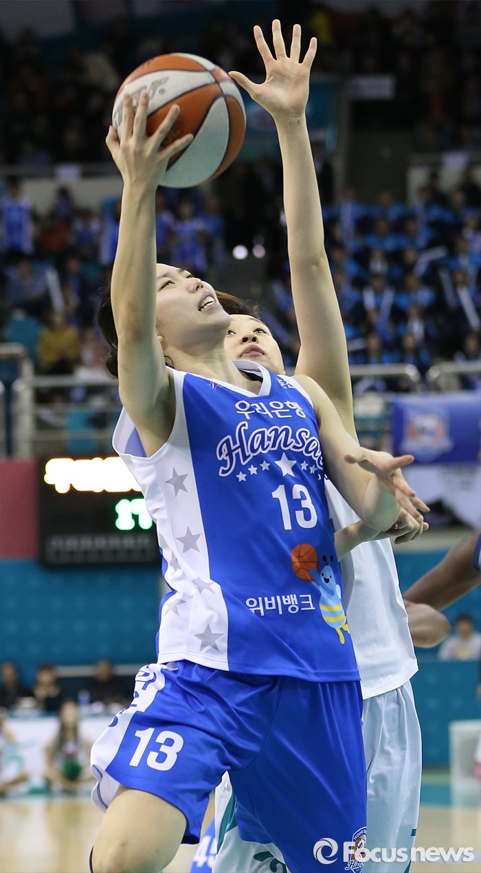 (부천=포커스뉴스) 20일 부천체육관에서 열린 2015-2016 여자프로농구 챔피언결전전 3차전 KEB하나은행-우리은행 경기에서 우리은행 이승아가 KEB하나 강이슬의 마크를 제치며 레이업슛을 시도하고 있다.