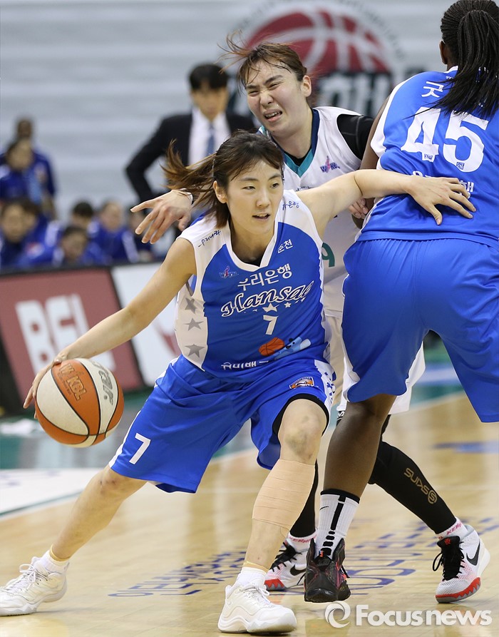 (부천=포커스뉴스) 20일 부천체육관에서 열린 2015-2016 여자프로농구 챔피언결전전 3차전 KEB하나은행-우리은행 경기에서 우리은행 박혜진이 돌파하는 사이 굿렛이 KEB하나 백지은을 저지하고 있다.