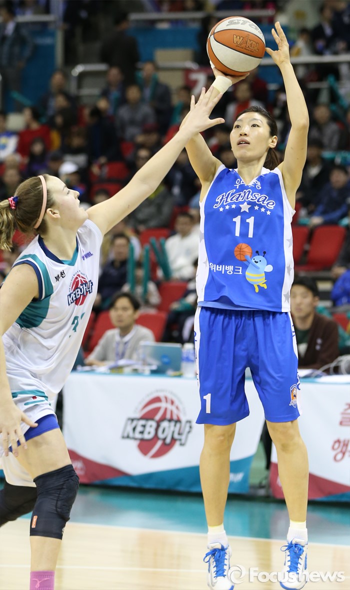 (부천=포커스뉴스) 20일 부천체육관에서 열린 2015-2016 여자프로농구 챔피언결전전 3차전 KEB하나은행-우리은행 경기에서 우리은행 임영희가 KEB하나 리스턴의 수비 위로 점프슛을 쏘고 있다.