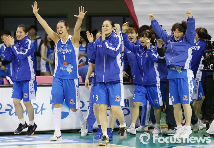 (부천=포커스뉴스) 20일 부천체육관에서 열린 2015-2016 여자프로농구 챔피언결정전 3차전을 승리하며 3승으로 우승을 차지한 우리은행 선수들이 환호하고 있다.