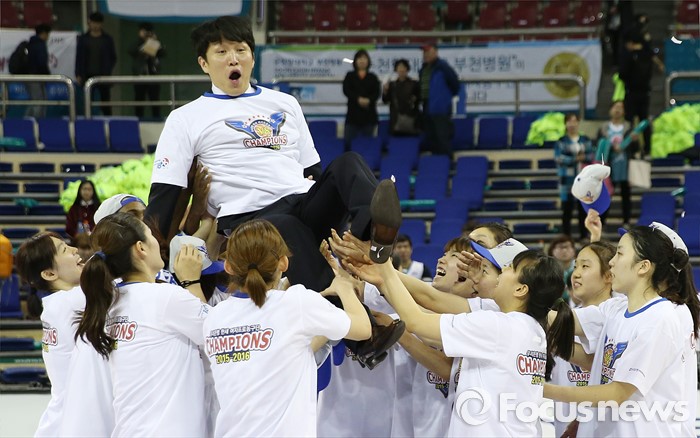 (부천=포커스뉴스) 20일 부천체육관에서 열린 2015-2016 여자프로농구 챔피언결정전 3차전에서 KEB하나은행을 물리치고 3승으로 통합 우승을 차지한 우리은행 선수들이 위성우 감독을 헹가래치고 있다.