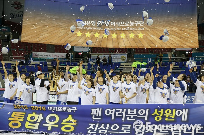 (부천=포커스뉴스) 20일 부천체육관에서 열린 2015-2016 여자프로농구 챔피언결정전 3차전에서 KEB하나은행을 물리치고 3승으로 통합 우승을 차지한 우리은행 선수들이 챔피언 모자를 던지며 환호하고 있다.
