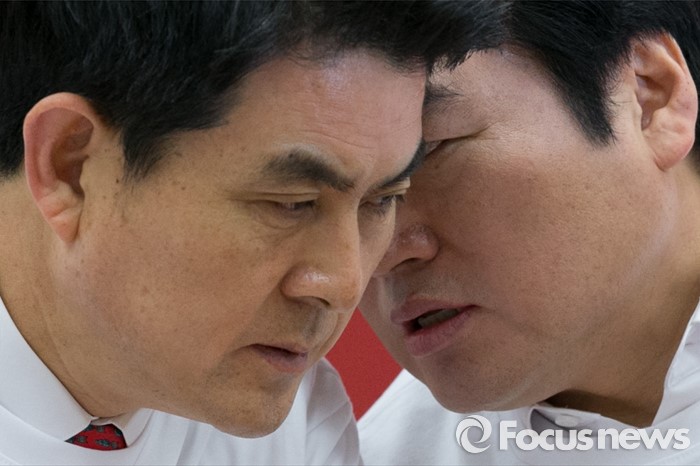 (서울=포커스뉴스) 원유철(오른쪽) 새누리당 원내대표와 김태호 최고위원이 21일 오전 서울 여의도 국회에서 열린 최고위원회의에 참석해, 귀엣말을 하고 있다.