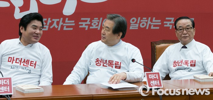 (서울=포커스뉴스) 김무성(가운데) 새누리당 대표와 원유철(왼쪽) 원내대표, 서청원 최고위원이 21일 오전 서울 여의도 국회에서 열린 새누리당 최고위원회의에 참석해, 20대 총선 홍보 노래영상을 보며 대화하고 있다.
