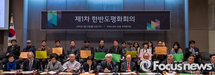 (서울=포커스뉴스) 21일 오전 서울 중구 프레스센터 국제회의장에서 열린 '제1차 한반도평화회의'에 참석한 종교계와 시민단체 관계자들이 남북간 무력시위 중단 및 개성공단 재가동을 촉구 하고 있다.