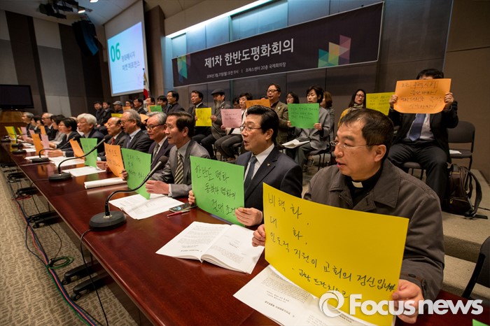 (서울=포커스뉴스) 21일 오전 서울 중구 프레스센터 국제회의장에서 열린 '제1차 한반도평화회의'에 참석한 종교계와 시민단체 관계자들이 남북간 무력시위 중단 및 개성공단 재가동을 촉구 하는 구호를 외치고 있다.