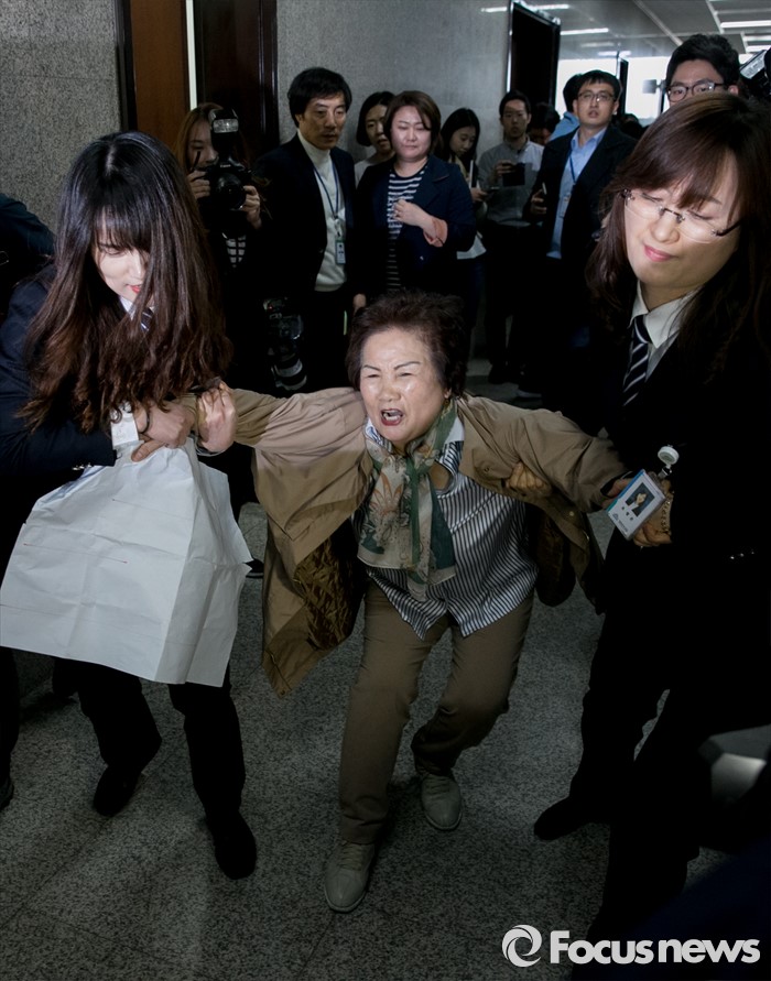 | △ 항의 중 끌려나가는 더민주 전국실버위원회 여성 당원 |