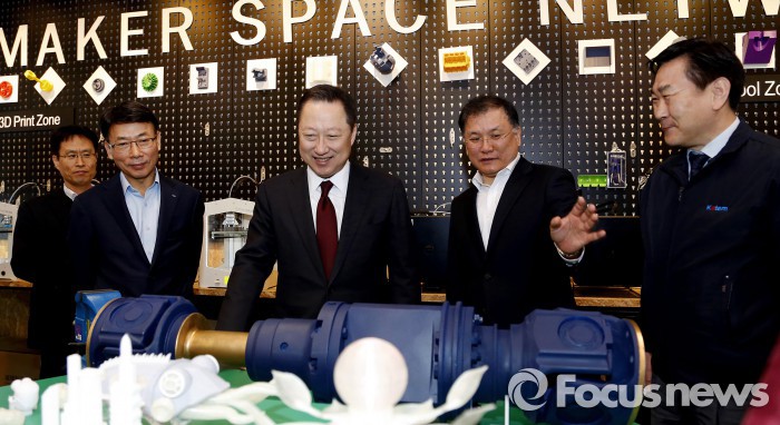 특히 전담기업 두산의 교육 인프라를 활용한 지역인재 육성에도 앞장서, 퇴직임원 경영 멘토링, 고용일자리 사업본부 구축, 창원대 글로벌 워터 엔지니어링 과정 개설 등 다양한 프로그램을 운영 및 계획 중이다.박용만 두산그룹 회장(가운데)이 21일 경남창조경제혁신센터를 방문해 입주기업 중 하나인 KATEM(산업기계 구동축 생산업체)이 3D프린터로 제작한 시제품에 대한 설명을 듣고 있다. <사진제공=두산그룹>