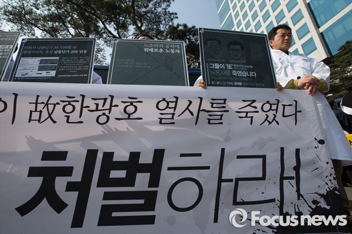 (서울=포커스뉴스) 21일 오전 서울 서초구 현대자동차 본사에서 유성기업 공대위와 시민사회단체 회원들이 유성기업 故 한광호 사망 현대자동차 규탄 기자회견을 하고 있다.
