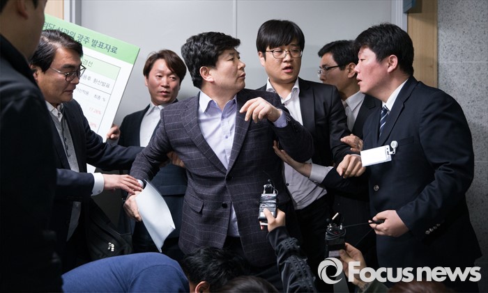 (서울=포커스뉴스) 21일 오전 서울 여의도 국회 의원회관에서 열린 국민의당 최고위원회의 회의장 앞에서 당원들이 호남 지역구 공천 결과에 대해 항의하고 있다.