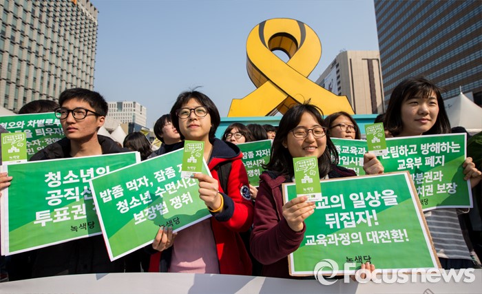 (서울=포커스뉴스) 21일 오전 서울 광화문 광장에서 열린 녹색당 교육(배움) 공약 발표 기자회견에 참석한 학생 및 당원들이 '학교를 뒤집자, 배움에 숨통을'이 적힌 소형 손팻말을 들고 있다.