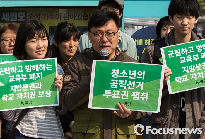(서울=포커스뉴스) 21일 오전 서울 광화문 광장에서 열린 녹색당 교육(배움) 공약 발표 기자회견에 참석한 하승수 공동운영위원장이 인사말을 하고 있다.