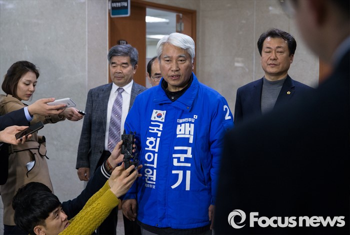 (서울=포커스뉴스) 경기도 용인갑 전략공천된 더불어민주당 백군기 의원이 21일 오후 서울 여의도 국회 정론관 앞에서 기자회견을 하고 있다.