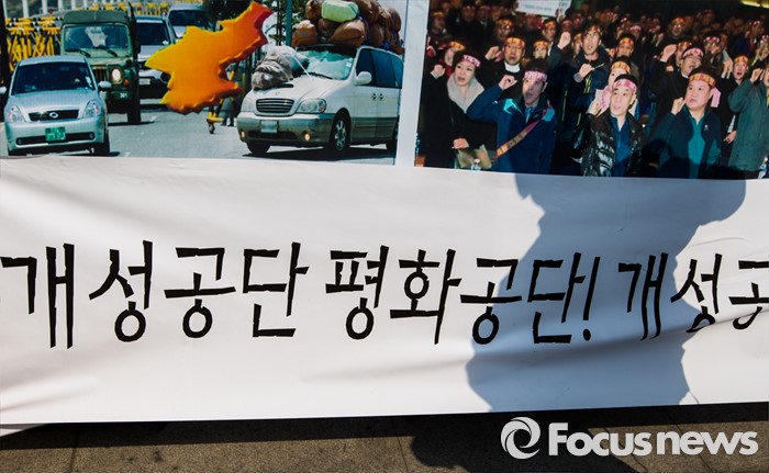 (서울=포커스뉴스) 21일 오전 서울 광화문 광장에서 개성공단 근로자 협의회 관계자들이 피해대책 특별법제정 청원 서명운동 본부를 설치하고 있다.