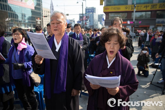(서울=포커스뉴스) 21일 오후 서울 중구 덕수궁 대한문 앞에서 한국기독교 장로회 총회 '고난당하는 민주주의를 위한 시국기도회'가 열리고 있다.