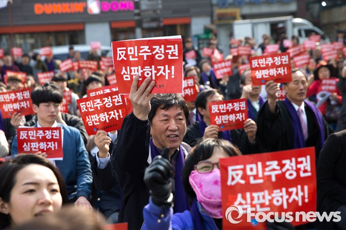 (서울=포커스뉴스) 21일 오후 서울 중구 덕수궁 대한문 앞에서 한국기독교 장로회 총회 '고난당하는 민주주의를 위한 시국기도회'가 열리고 있다.