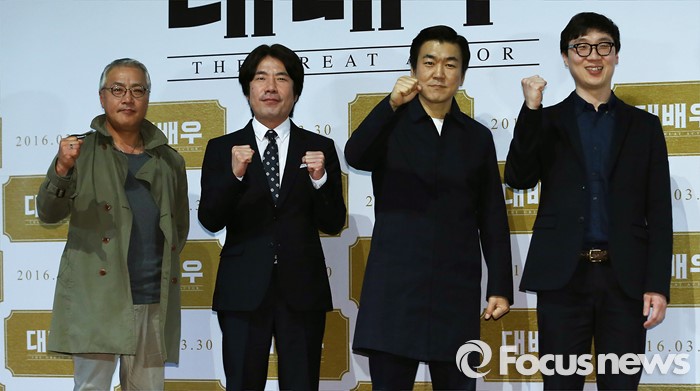 (서울=포커스뉴스) 21일 오후 서울 광진구 건대입구 롯데시네마에서 열련 영화 '대배우' 언론시사회에 참석한 배우 이경영(왼쪽부터), 오달수, 윤제문과 영화감독 석민우가 포토타임을 갖고 있다.