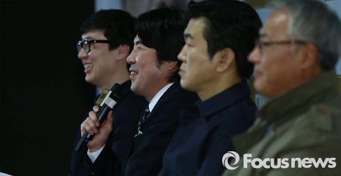 (서울=포커스뉴스) 21일 오후 서울 광진구 건대입구 롯데시네마에서 열련 영화 '대배우' 언론시사회에 참석한 배우 오달수(왼쪽 두번째)가 취재진의 질문에 답하고 있다. 왼쪽부터 영화감독 석민우, 배우 오달수, 윤제문, 이경영.