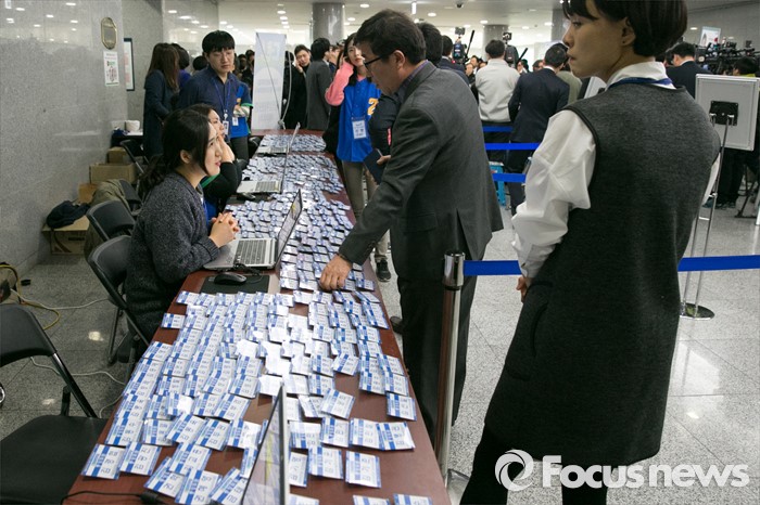 (서울=포커스뉴스) 21일 오후 서울 여의도 국회 의원회관에서 더불어민주당 중앙위원회의에 참석한 당원들이 이름표를 받고 있다. 이날 더민주 중앙위는 오후 3시 열릴 예정이었으나, 두 차례 연기를 거듭해, 오후 8시 열기로 결정됐다.
