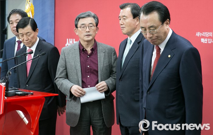 (서울=포커스뉴스) 이한구 새누리당 공천관리위원장과 위원들이 21일 오후 서울 여의도 당사에서 20대 총선 여론조사 경선 결과 발표를 마친 뒤 퇴장하고 있다. 왼쪽부터 박종희 위원, 황진하 부위원장, 이 위원장, 홍문표, 김회선 위원.