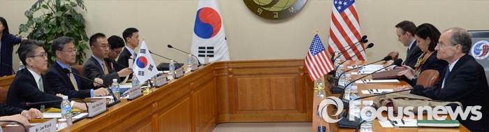 (서울=포커스뉴스) 21일 서울 종로구 도렴동 외교부 청사에서 한미 양국 6자회담 수석대표인 김홍균(왼쪽 첫번째) 외교부 한반도평화교섭본부과 대니얼 프리드(오른쪽 첫번째) 국무부 제재정책 조정관이 참석한 가운데 한미 고위급 대북제재 협의가 열리고 있다. 한미 간 제재협의 형식으로 처음 갖는 이번 회동에서 양국은 전방위 대북압박 강화를 논의했다.