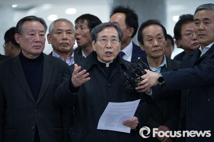 (서울=포커스뉴스) 더불어민주당이 비례대표 선정 문제를 놓고 진통을 겪고 있는 가운데 함세웅 신부(민주주의국민행동 상임대표)와 소속단체 대표들이 21일 국회 의원회관에서 예정된 더민주 중앙위원회의를 앞두고 김종인 대표의 '셀프 공천' 취소 및 공천안 전면 수정을 촉구하는 기자회견을 하고 있다. 이날 더민주 중앙위는 오후 3시 열릴 예정이었으나, 두 차례 연기를 거듭해, 오후 8시 열기로 결정됐다.