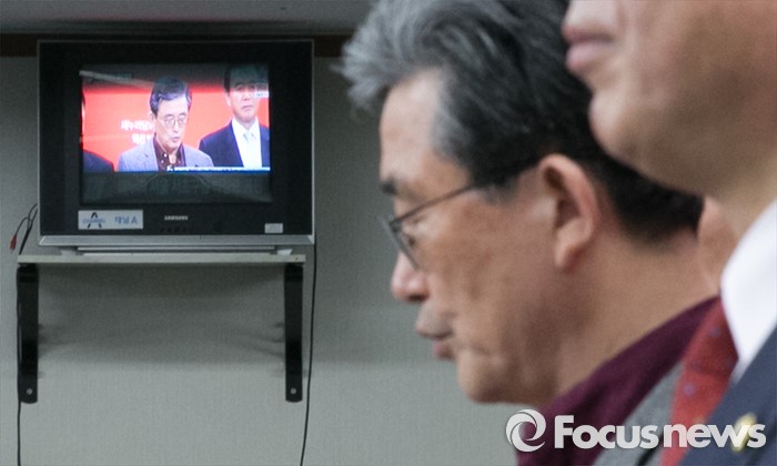 (서울=포커스뉴스) 이한구 새누리당 공천관리위원장과 위원들이 21일 오후 서울 여의도 당사에서 20대 총선 여론조사 경선 결과 발표를 하고 있다.