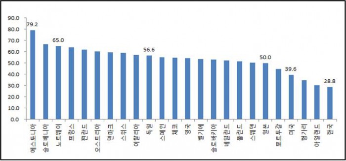 이는 독일 73.9%(2014년 기준), 영국 85.3%(2010년 기준), 프랑스 90.0%(2010년 기준), 일본 82.1%(2011년 기준) 등과 비교해 매우 낮은 수준으로 소득불평등 확대를 통한 가계부채 증가, 중산층 비중 감소 등 경제사회의 불안요인으로 작용할 수 있다.