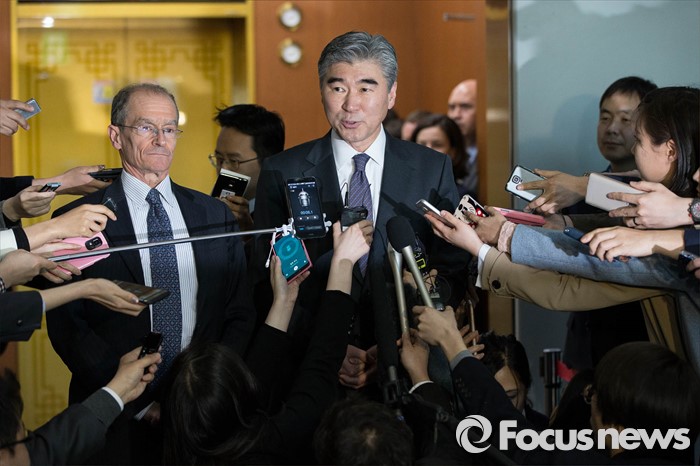 (서울=포커스뉴스) 성 김(가운데) 미국 국무부 동아태 부차관보 겸 대북정책특별대표와 대니얼 프리드(왼쪽) 미국 국무부 제재정책조정관이 21일 오후 서울 종로구 외교부에서 '한미 고위급 대북제재 협의'를 마친 후 취재진의 질문에 답변하고 있다.