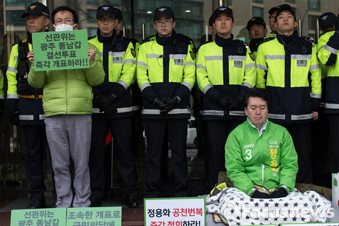 (서울=포커스뉴스) 국민의당에서 공천 탈락한 정용화 전 광주유니버시아드 조직위원회 부위원장이 22일 오전 서울 마포구 국민의당 당사 앞에서 경선 결과에 부당함을 호소하는 시위를 하고 있다.