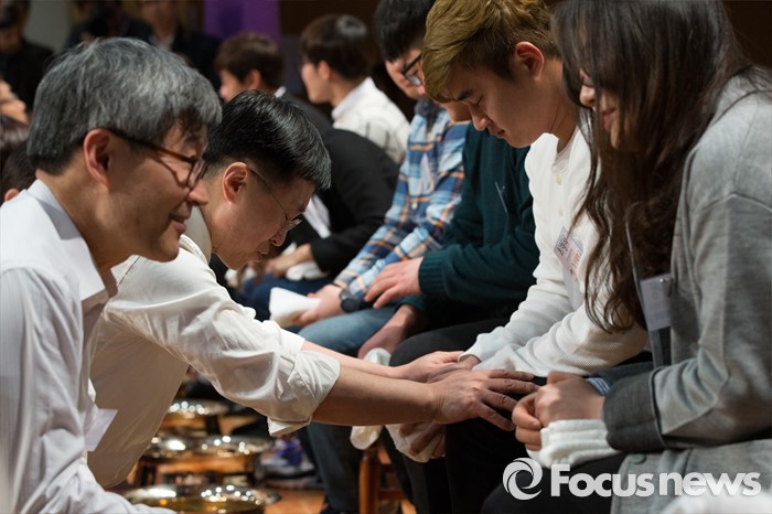 (서울=포커스뉴스) 22일 오후 서울 서대문구 명지대학교 세족식 행사에서 한 교직원이 학생의 발을 씻긴 후 기도를 하고 있다.