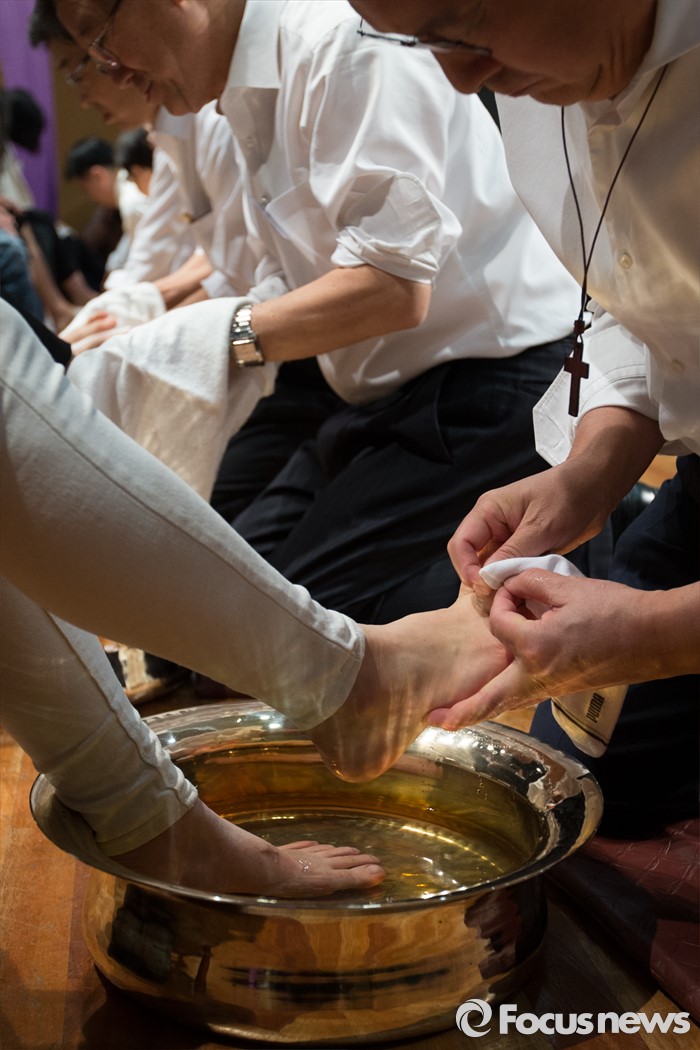 (서울=포커스뉴스) 22일 오후 서울 서대문구 명지대학교 세족식 행사에서 유병진 총장을 비롯한 교직원들이 학생들의 발을 씻겨주고 있다.
